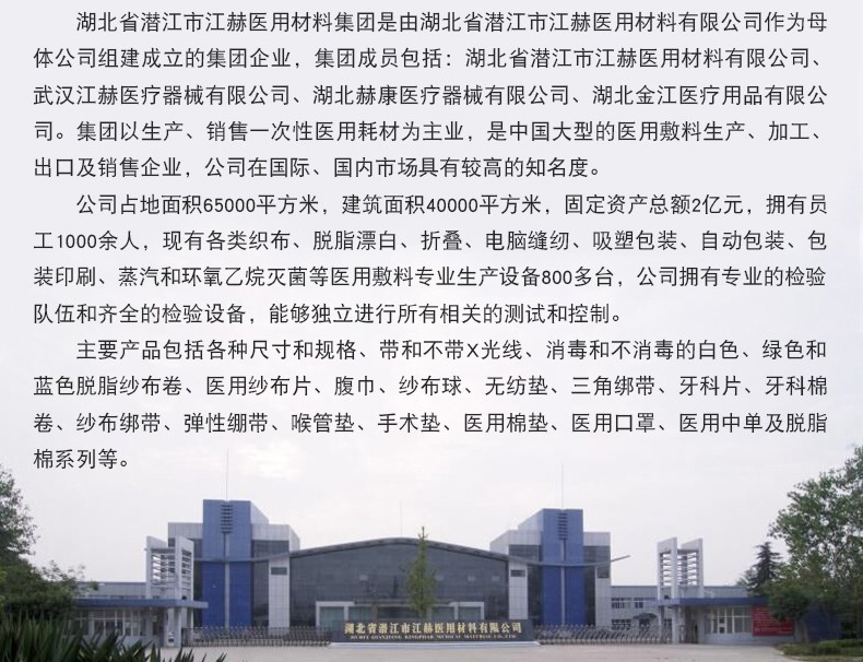 湖北江赫醫用材料有限公司是中國大型醫材生產企業,從事于醫用衛材行業已經有30年的歷史,是中國醫用衛材行業出口十強企業之一,公司是同行業最早通過ISO國際質量管理體系、CE認證的企業之一。