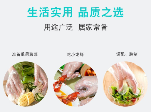 用途:一次性PE手套多用于家庭清潔,化學檢驗,機械園藝,食品、衛生及工農業防護,染發,護理洗滌,用餐(如吃龍蝦,大骨頭)等等,佩戴可免去洗手之不便。