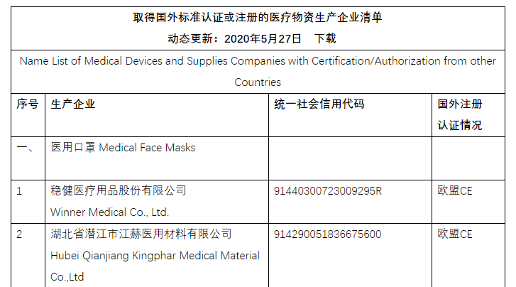 取得國外標(biāo)準(zhǔn)認(rèn)證或注冊(cè)的醫(yī)療物資生產(chǎn)企業(yè)清單